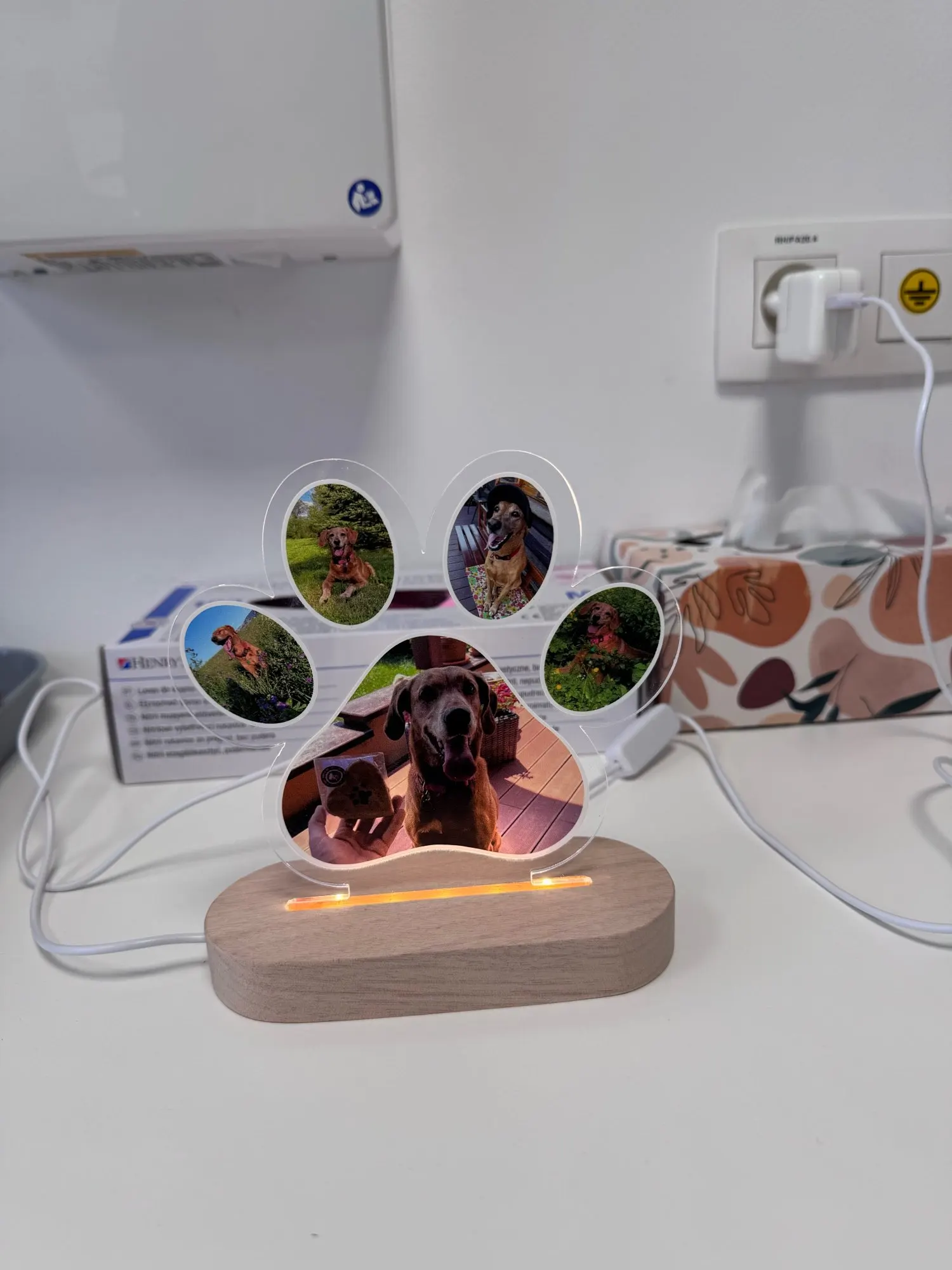 Bring your favorite heartwarming moments to life with a personalized dog paw lamp! No more hidden photos in your phone—just upload your top 5 memories and let your best friend's light brighten up your favorite room every single night.